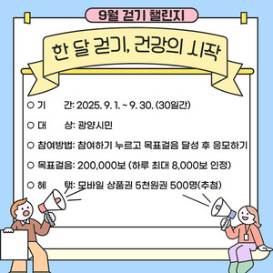 광양시가 지역주민의 건강생활 실천을 돕기 위해 11월 1일부터 30일까지 모바일 걷기 앱 「워크온」에서 ‘건강으로 가는 한걸음 11월 걷기 챌린지’를 운영한다.이번 걷기 챌린지는 1걸음당 1마일리지가 적립되며, 1일 최대 8천 마일리지가 누적된다. 기간 중 20만 보를 달성하면 20만 마일리지가 쌓여 모바일상품권(5천 원권) 응모가 가능하다. 시는 목표 걸음을 달성한 참여자 중 추첨을 통해 800명에게 상품권을 지급할 예정이다.참여를 희망하는 시민은 모바일 걷기 앱 ‘워크온’을 설치하고 ‘광양시 공식 커뮤니티’에 가입한 뒤, 챌린지