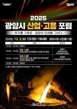 광양시가 오는 12월 2일 오후 1시 30분, 시청 시민홀에서 ‘2025 광양시 산업‧고용 포럼’을 개최한다.올해 포럼은 ‘위기를 기회로’라는 슬로건 아래 산업·고용 전반의 위기 요인을 진단하고, 향후 광양시가 마련해야 할 전환 전략을 논의하는 데 중점을 뒀다. 시는 산업‧고용 분야 전문가를 초청해 글로벌 경기 둔화와 산업환경 변화로 어려움을 겪고 있는 철강산업의 현황을 점검하고, 고용 안정 및 미래 성장동력 확보 방안을 모색할 계획이다.산업 분야에서는 전남테크노파크 주력산업본부 김명수 본부장이 ‘철강산업의 위기 대응과 신산업 리디