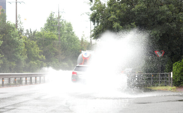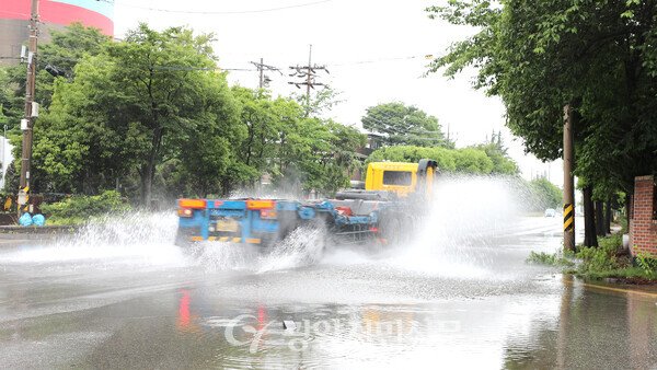 광양시가 사후 수습이 아닌 철저한 사전 예방식의 재난 대응을 강조하며 풍수해 예방에 나서고 있지만 매년 반복되는 침수 취약 지역 침수는 여전하다. 지난 14일 광양시 강수량은 73.2mm로 오전 8시부터 12시까지 51mm가 내렸다. 이날 오전 10시경 침수된 태인동 연관단지 내 도로 모습.