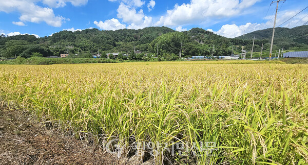 지난 4월 중순 모내기한 기능성 조생종 벼가 진월면 차사리 들녘에서 누렇게 익어가고 있다. 이 벼는 9월 초 수확해 명절 선물용으로 판매할 예정이다.
