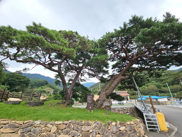 김세광 씨의 안내를 받아 동네를 한 바퀴 걸었다. 우선 마을의 첫째 보물이자 상징은 아주 기품이 있는 소나무 두 그루, 이름은 용란송(龍卵松)이다.