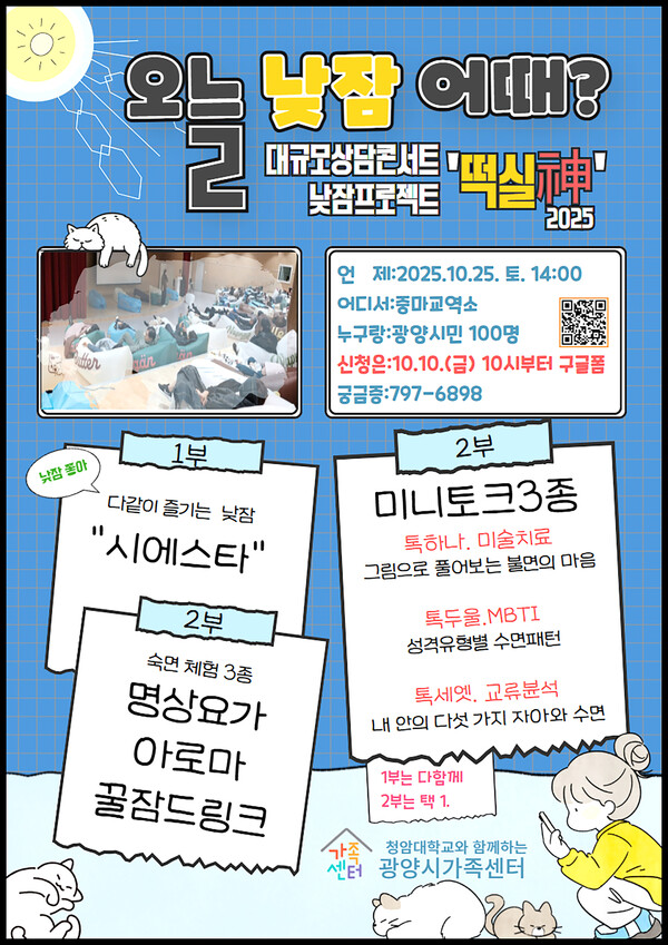 광양시가족센터가 오는 25일 오후 2시, 중마교역소에서 광양시민과 함께하는 대규모 상담콘서트 ‘낮잠 프로젝트 떡실神’을 운영한다.