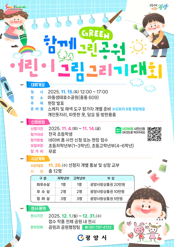 광양시가 오는 15일 마동생태호수공원에서 ‘2025 광양시 「함께 Green 공원」 어린이 그림그리기 대회’를 개최한다.