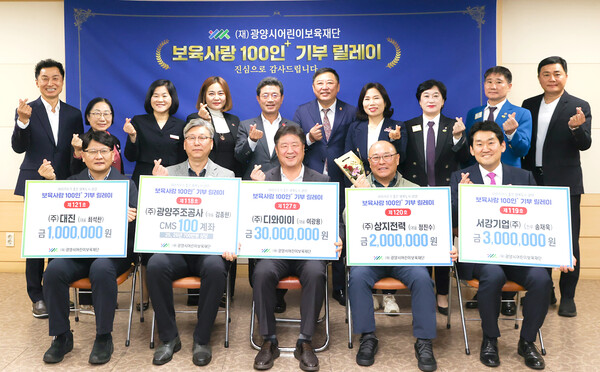 (재)광양시어린이보육재단이 지난 7일 시청 만남실에서 정인화 광양시장, 이광용 이사장, 기탁자 등 20여 명이 참석한 가운데 「보육사랑 100인+ 기부 릴레이」 후원금 기탁식을 가졌다.