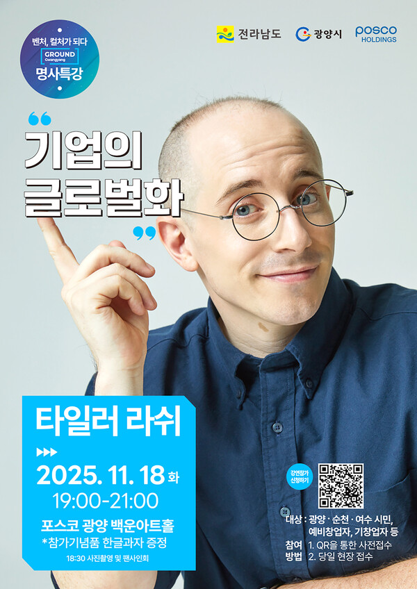 광양시가 오는 18일 오후 7시 백운아트홀에서 열리는 ‘2025년 제3회 광양 스타트업 콘서트’에 방송인 타일러 라쉬를 초청해 글로벌 특강을 진행한다고 밝혔다.