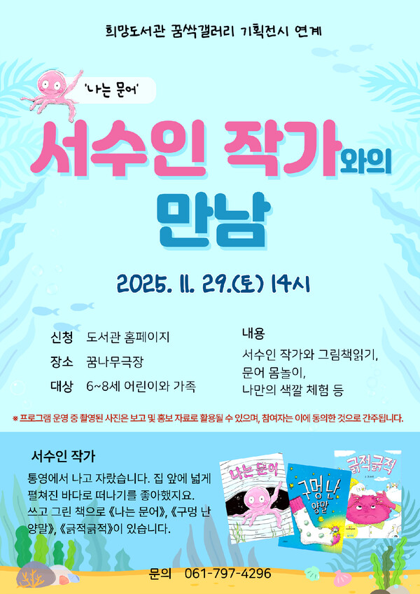 희망도서관이 오는 29일 꿈싹갤러리에서 현재 성황리에 운영 중인 기획전시 『그림책이 반짝, 친구가 되는 순간』과 연계해 『나는 문어』의 저자 서수인 작가와의 만남 행사를 진행한다.