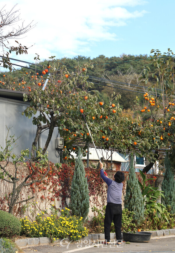 가을빛으로 물든 감나무에서 감을 따는 재동마을 한 어르신의 손길이 분주하다. 가을 햇살 아래 탐스럽게 익은 감나무 사이로, 오래된 손길의 따스함과 시골 마을의 고요한 계절 풍경이 잔잔하게 스며든다.