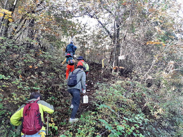광양문화연구회원과 후손 일행 9명은 한 줄로 서서 능선을 오르기 시작했다. 미지의 세계를 탐험이라도 하듯 일행들의 마음은 들떠있었다. 그러나 우리 앞에 나타나는 길은 생각보다 가팔랐고 키 큰 나무들로 울창했다. 선두에 선 몇 사람은 가위를 준비해 길게 자란 풀을 베거나 누운 나무들이나 낙엽 더미를 치우면서 뒷사람들의 통행을 도왔다. 출발한 지 얼마 지나지 않았는데도 위로 내딛는 다리는 무거워지고 여기저기서 일행의 거친 숨소리가 들려왔다.