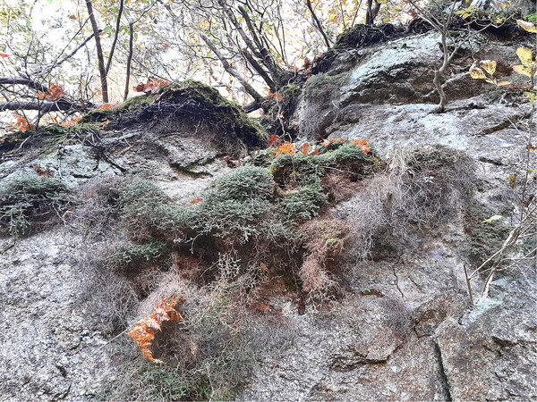 넓은 바위에서 오랜 세월을 자라온 이끼들이 가을인데도 초록빛으로 빛나고 있었다. 거대한 이끼를 바라보는 것만으로도 훌륭한 풍경이었다. 바위로 흐르는 물은 단순히 흘러가는 것이 아니라 자연을 키우고 사람을 키워 온 것이었다. 큰 바위 사이에 열린 공간으로 石扃(석경. 돌문)이라 쓰인 현판이 걸려있고 녹슬어 있는 작은 철문을 열면 巖棲瓦(암서와. 바위집)라는 현판이 보였다. 선비가 글을 읽었던 작은 방이었다. 일행들은 방 맞은편에 얼기설기 목재 기둥으로 지은 정자에 앉아 끝 간데없이 펼쳐진 산을 바라보았다.