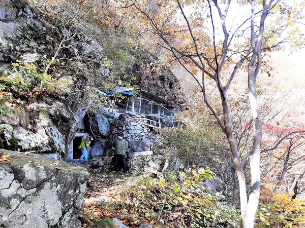 붉고 노랗게 물든 단풍들이 장관을 이루고 있는 사이로 돌연 거대한 암반 더미가 얼굴을 내밀었다. 산은 오르막길을 이겨낸 우리의 수고에 선물하듯 멋진 풍경을 보여주었다. 일행의 얼굴에는 함박꽃이 피었고 저마다 풍경을 담느라 바빴다. 단풍 속에 있는 암서와는 장엄했다. 위로는 큰 바위가 지붕처럼 펼쳐지고 빈 공간 사이 사이에 내민 바위들은 튼튼한 기둥이며 벽이 되었다. 바위틈으로 물이 방울방울 떨어져 내렸다. 선비가 지내는 동안 마시던 물이었다.