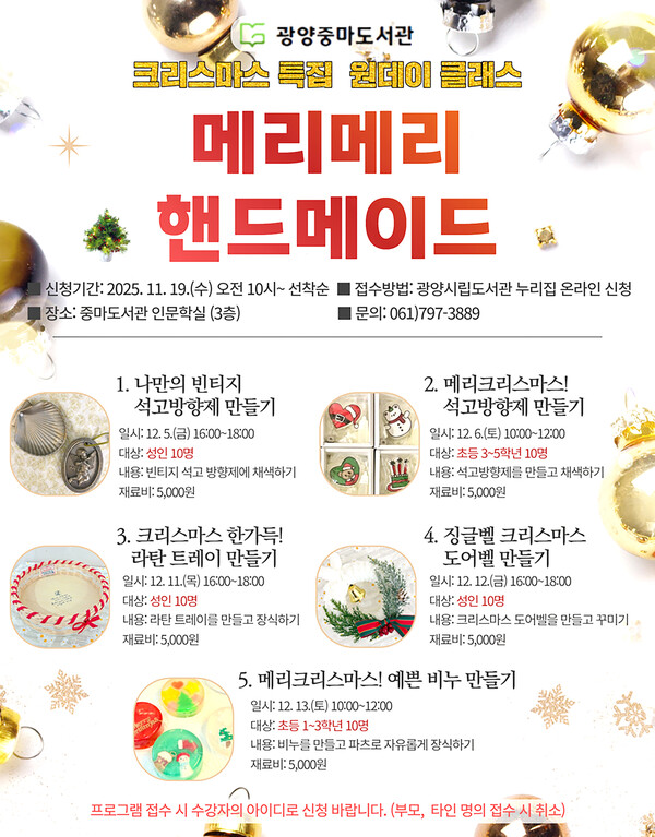 이번 강좌는 크리스마스를 주제로 한 핸드메이드 소품 만들기 프로그램으로 구성됐다. 세부 강좌는 △초등 1~3학년 대상 ‘메리크리스마스! 예쁜 비누 만들기’ △초등 3~5학년 대상 ‘메리크리스마스! 석고 방향제 만들기’ △성인 대상 ‘나만의 빈티지 석고 방향제 만들기’ △‘크리스마스 한가득! 라탄 트레이 만들기’ △‘징글벨 크리스마스 도어벨 만들기’ 총 5개다.