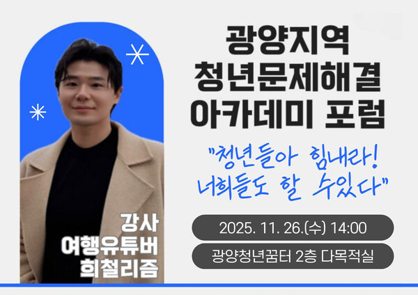 광양시가 순천대학교 ‘글로컬대학30 사업’과 연계해 오는 26일 오후 2시, 광양청년꿈터에서 ‘2025 광양역 청년 문제 해결 아카데미 포럼’을 개최한다.